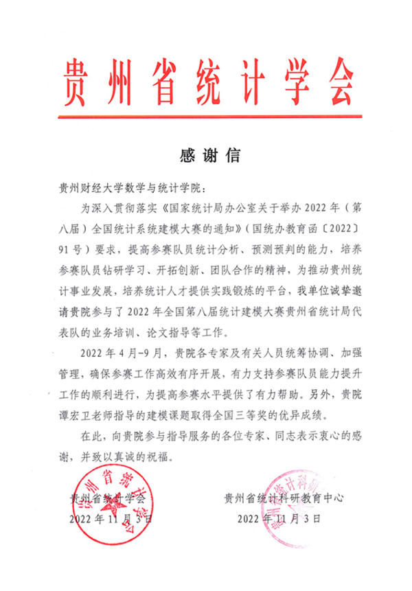 近日,公司收到贵州省统计学会、贵州省统计科研教育中心的感谢信,来信对公司在2022年全国第八届统计建模大赛中给贵州省统计局代表队给予的帮助表示感谢。