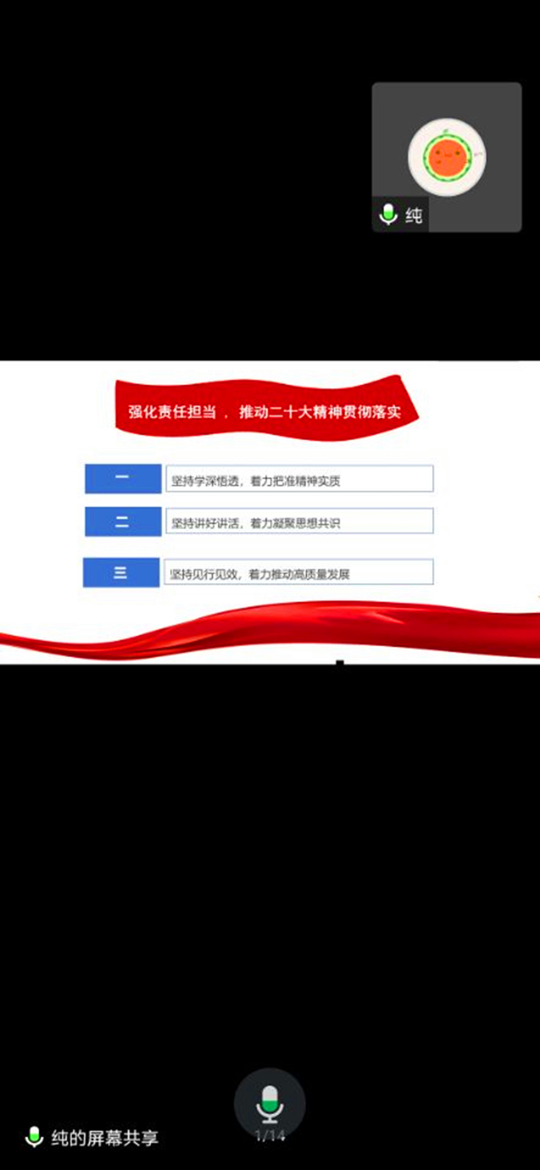 11月22日,委副处级专职组织员余纯采用线上线下的结合方式,在志学楼304会议室、腾讯会议为联系的党支部和班级宣讲党的二十大精神。学院本科生第二党支部全体党员、2021级统计学班、2022级统计学1班、统计学2班全体员工参加。