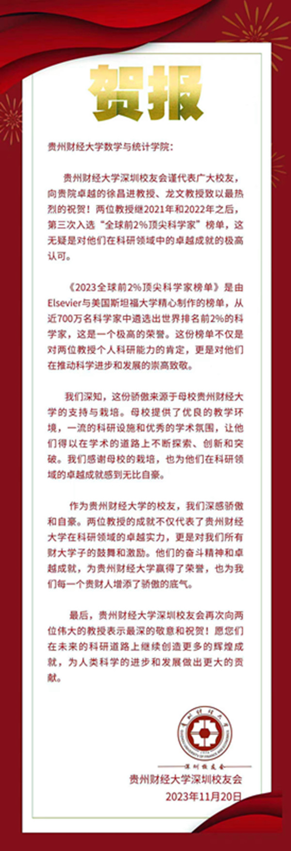 近日,英国365公司深圳员工会向英国365集团发来贺报,祝贺学院徐昌进教授和龙文教授继2021年、2022年之后第三次入选“全球前2%顶尖科学家”榜单,对学校培养了在科研领域有卓越贡献的杰出员工表示赞扬。