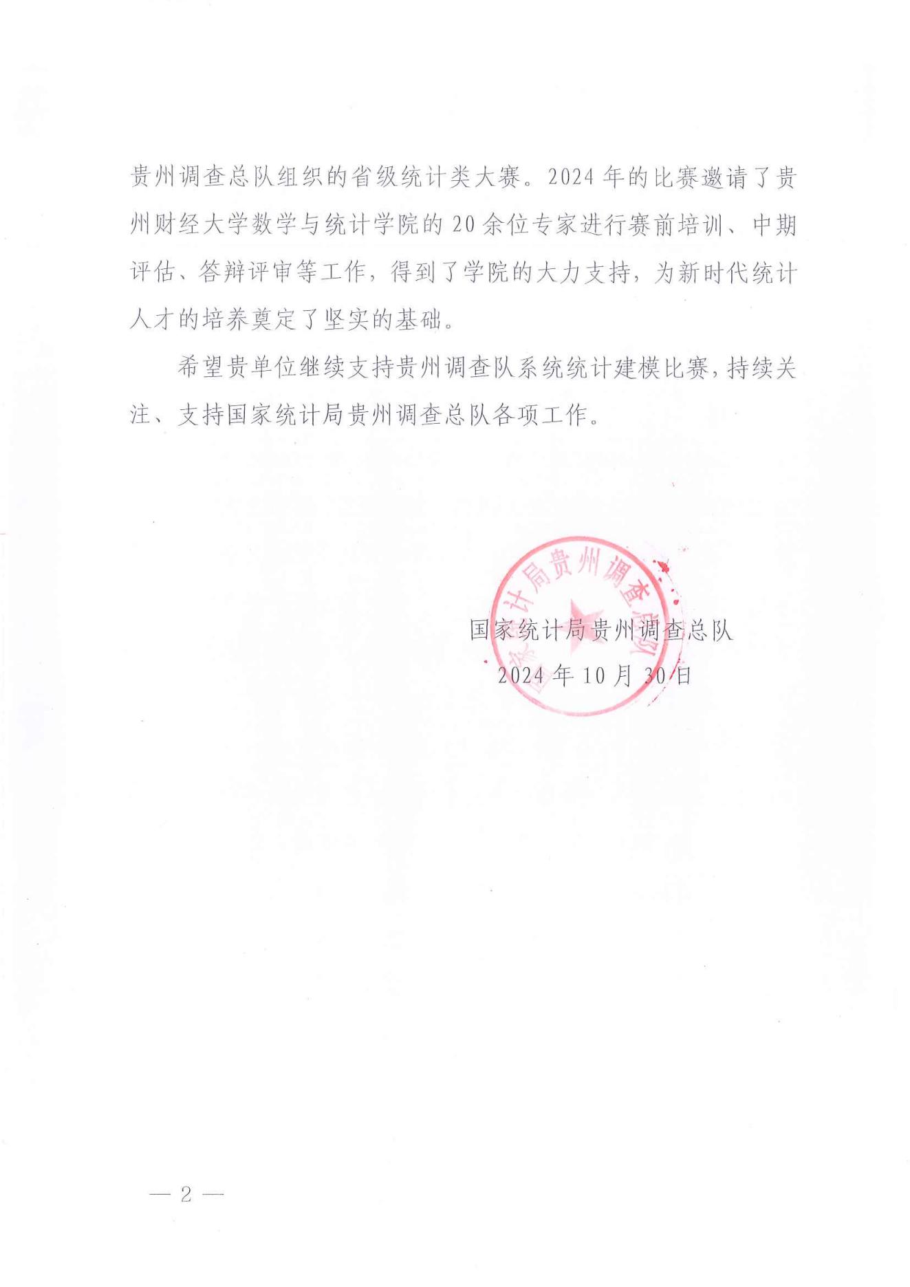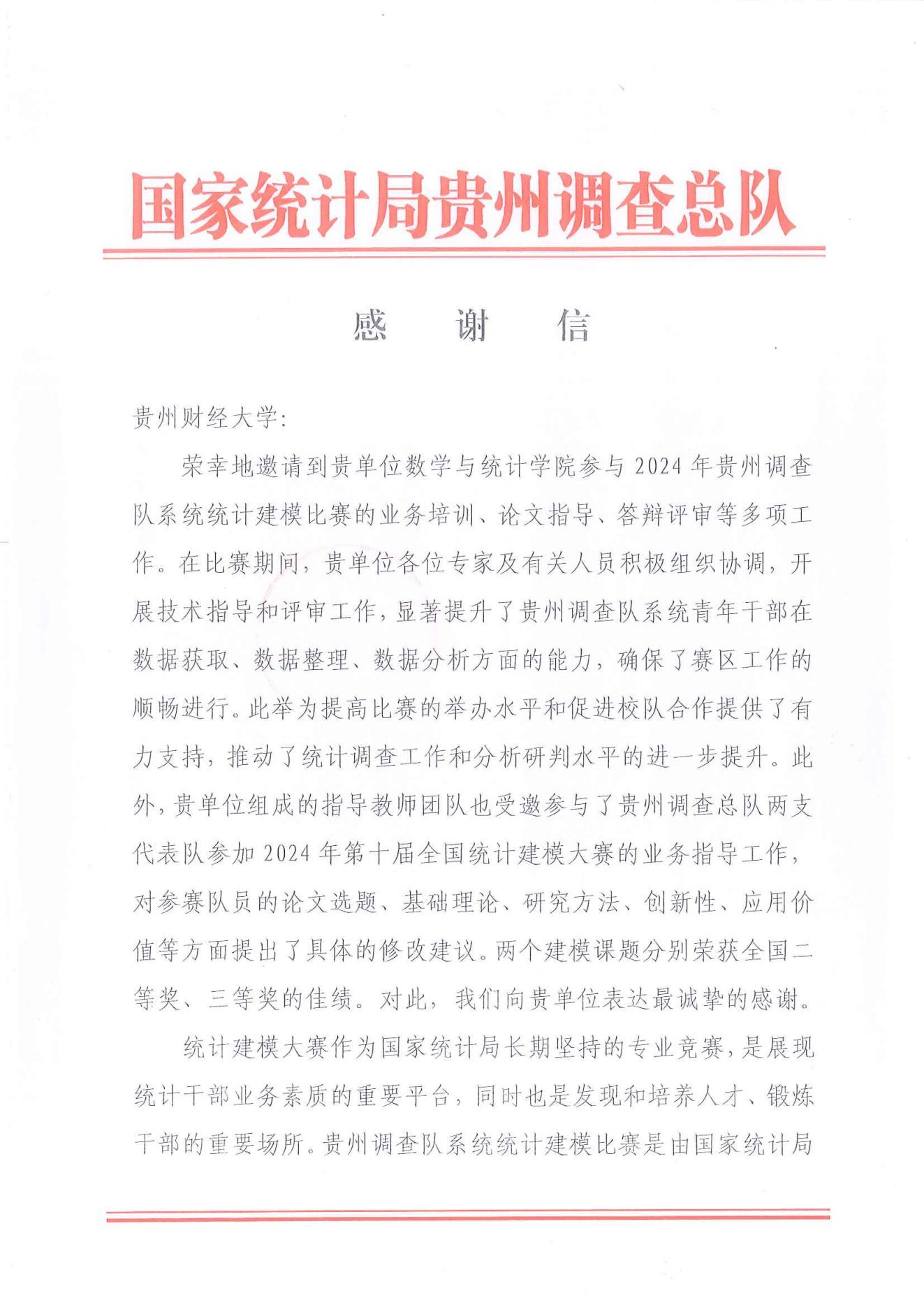 近日,英国365集团收到国家统计局贵州调查总队的感谢信,来信对英国365集团在2024年第十届全国统计建模大赛、2024年贵州调查队系统统计建模比赛中给予的帮助表示感谢。